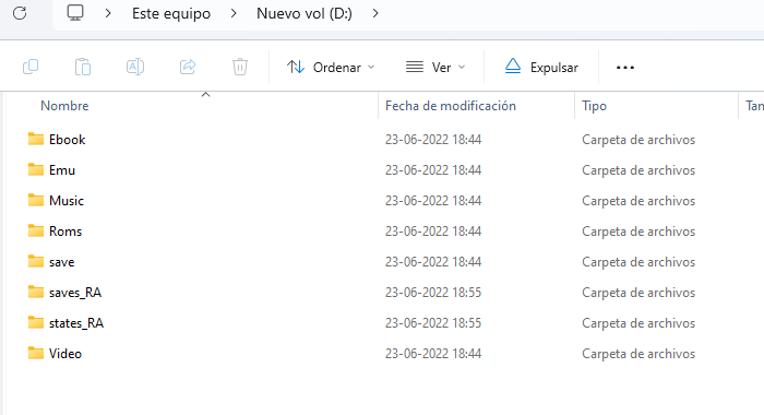 🔹 Dentro de ROMS, verás subcarpetas con nombres abreviados de distintas consolas.